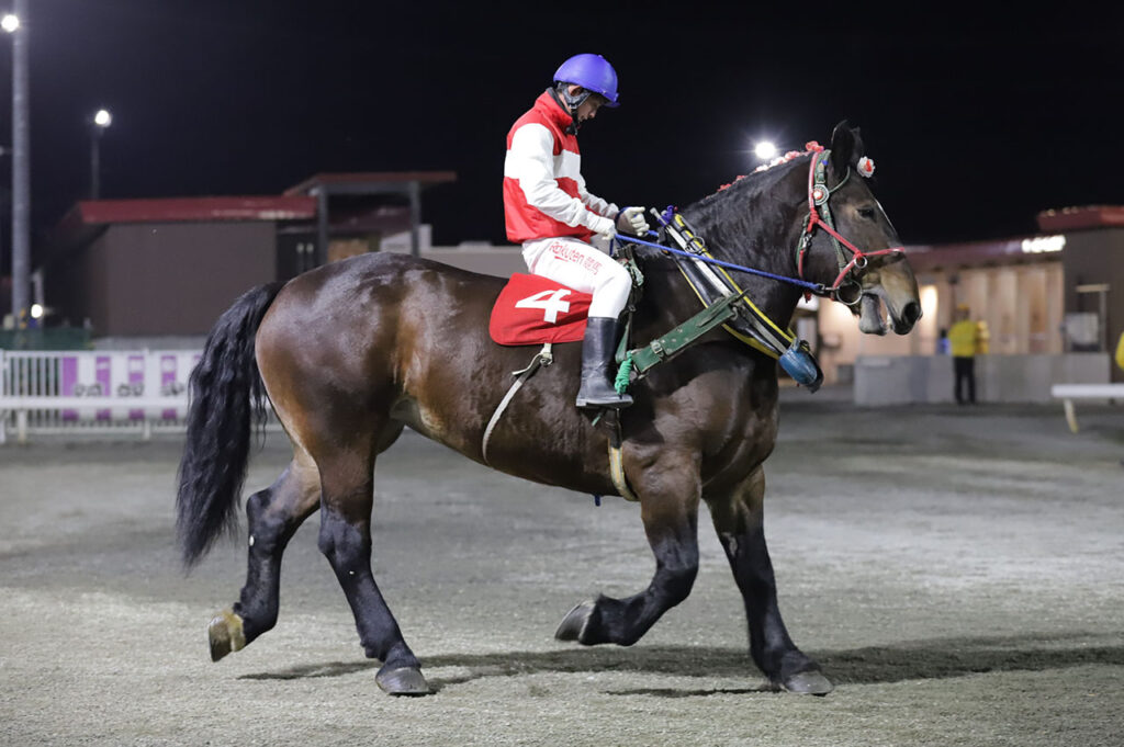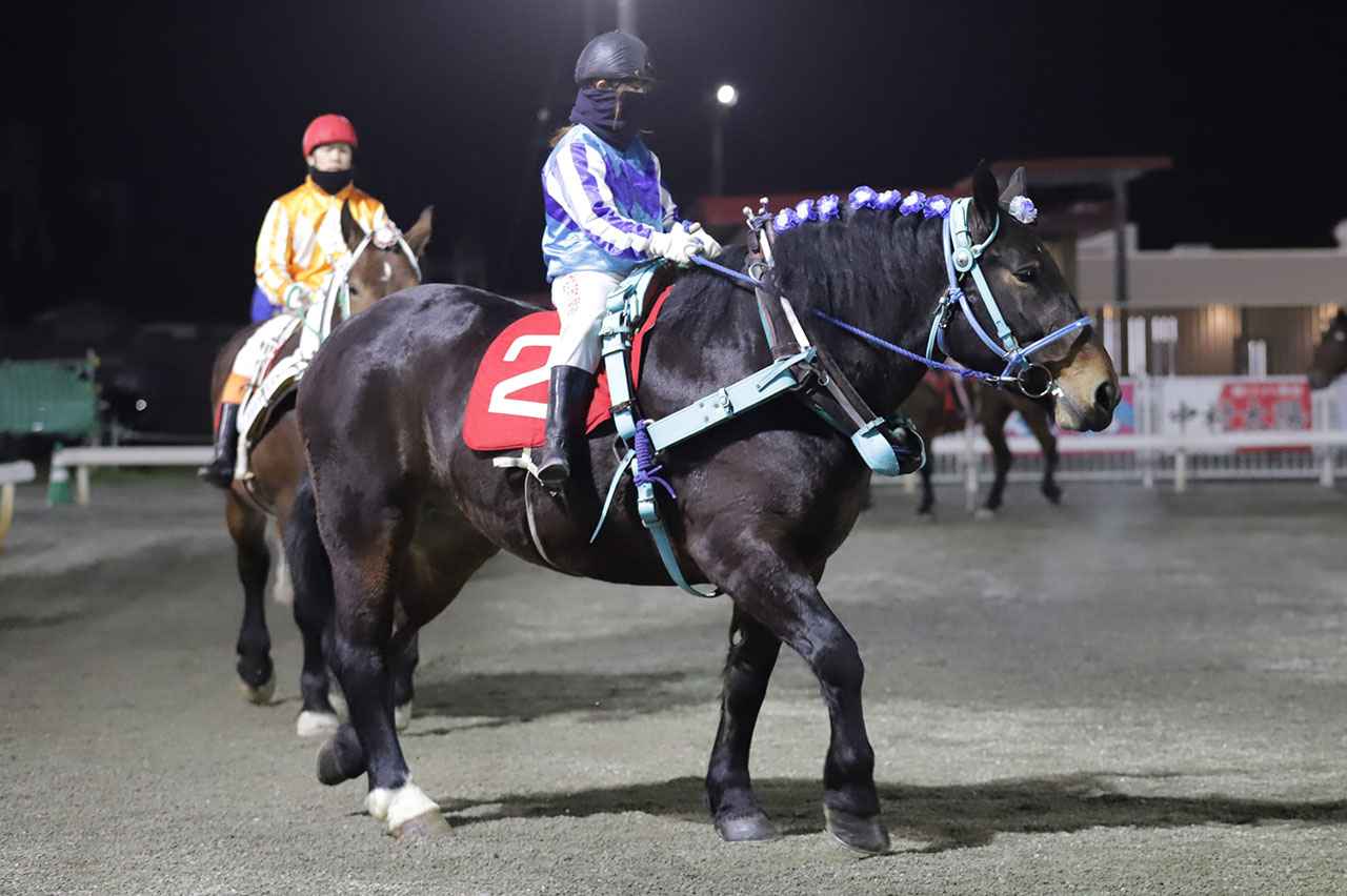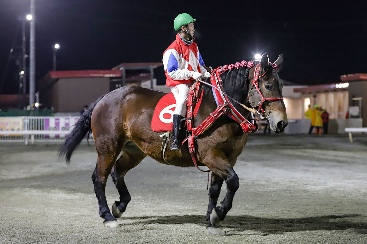 お母さんのホクショウモモは、ばんえいオークスの勝ち馬です。このホクショウモモの母の福花には遠い祖先にサラブレッドのオークス馬をスウヰイスーがいます。ホクショウレディーはサラブレッドのオークス馬とばんえいオークス馬の血を引くというとても稀有な馬です。とはいえ7~8代も前だともうサラブレッドの面影は全然ないのですけれど…。ホクショウレディーも3歳~4歳にかけて成長してきた馬でした。クインカップのレース運びは赤塚騎手のファインプレーだと思います。第1障害を降りてから、第2障害に向かう道中も焦らず後ろから行って、さらに坂下でも十分にために溜めてすんなり上手に第2障害をクリアすると、見事な末脚で2着に入りました。届かなかったら仕方がないと腹をくくった赤塚騎手と、騎手の勝負に応えて素晴らしい末脚を使ったホクショウレディーのベストレースだと思います。生産者のご家族が熱い声援を送っていて、有力馬を差し切って2着に入った時にとても喜んでいたのが印象的でした。