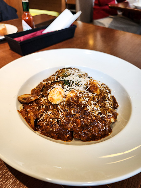 麦音の後はトスカチーナでパスタランチを楽しみました。ここは柳月の経営するパスタ屋さんで、店内の半分はスイーツ販売エリアです。こちらでも十勝マッシュ入りのボロネーゼをたのみました。目の前で上からチーズをたっぷり削りかけてくれます。来店者にもれなく柳月の三方六がオマケでついてきました。柳月も六花亭もレストラン経営をしており、どちらも本当に美味しいんです。今回は行きませんでしたが、六花亭の喫茶では季節のピザがおすすめですよ。